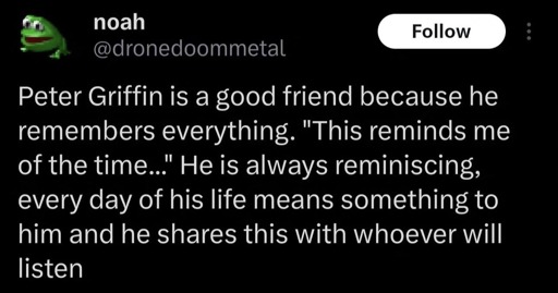 Jordan Roher to HumorEnglish · 10 days agoPeter Griffin is a good friendimagemessage-square0linkfedilinkarrow-up11arrow-down10