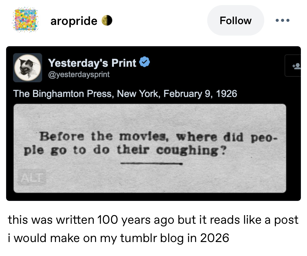Jordan Roher to HumorEnglish · 6 days agoWhere did people go to do their coughing?imagemessage-square0linkfedilinkarrow-up11arrow-down10
