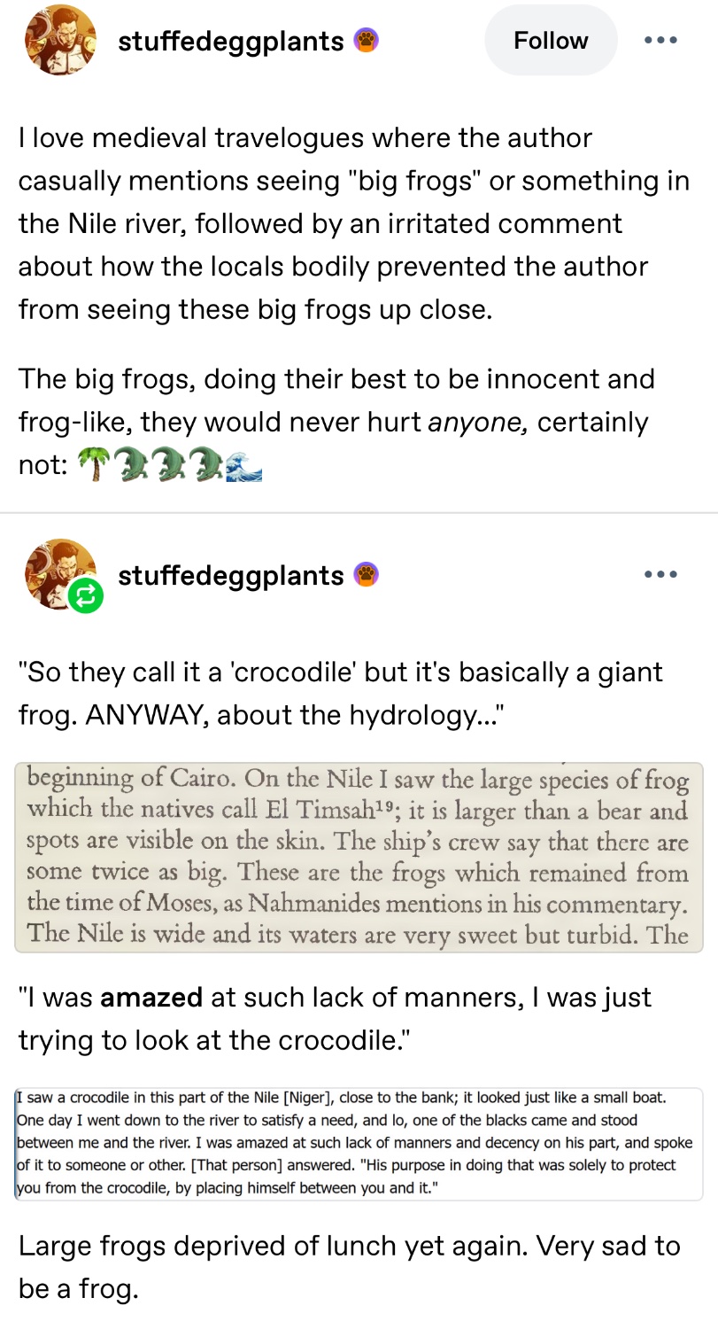arrow-up11arrow-down1imageBig frogs in the riverJordan Roher to HumorEnglish · 1 day agomessage-square0linkfedilink