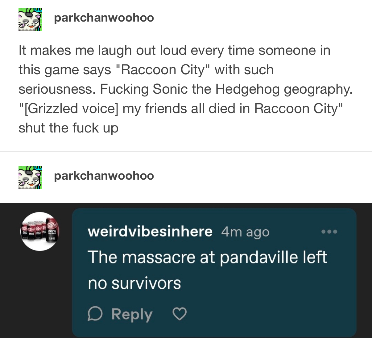 arrow-up11arrow-down1imageMy friends all died in Raccoon CityJordan Roher to HumorEnglish · 2 days agomessage-square0linkfedilink